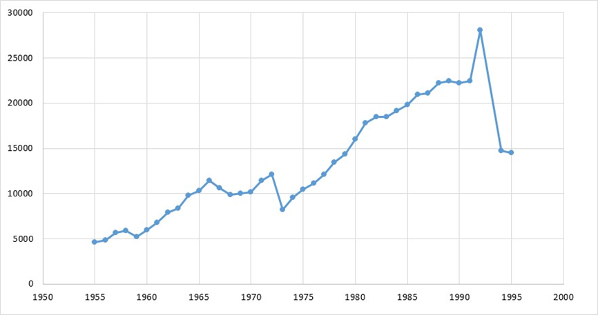 Imagen 2: Autotransporte de pasajeros registrado en la provincia de Buenos Aires, en unidades (1955-1995)