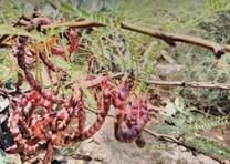 Fruto: vaina chata amarillo claro/ carnoso. Semillas similares a porotos duros de color amarillo claro |