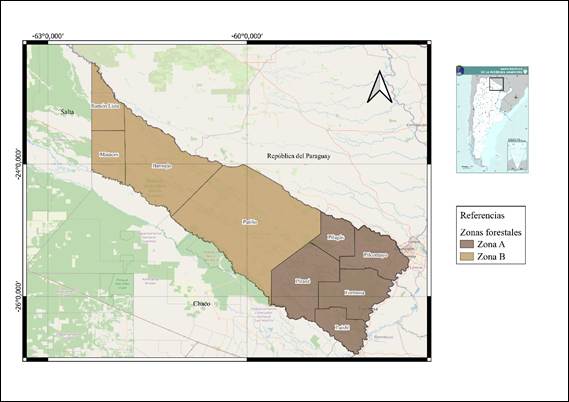 Como se observa en la Figura 4, la provincia se divide en dos zonas forestales (Zona A y Zona B), distribuidas en distintos departamentos, lo que refleja la diversidad territorial y el potencial productivo diferenciado. Estas áreas concentran los principales polos de desarrollo de la cadena foresto-industrial, con localidades como Pirané y Palo Santo que presentan la mayor integración de los eslabones productivos vinculados a la madera y sus derivados.
