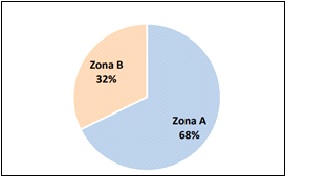 Los datos del cuadro 1 evidencian que la expansión de la superficie forestada con algarrobo en Formosa se traduce en una mayor disponibilidad de materia prima, condición necesaria para el sostenimiento de la estructura foresto-industrial provincial. Este proceso favorece la consolidación de polos productivos como Pirané y Palo Santo, donde la base forestal ampliada fortalece el funcionamiento y la proyección de los aserraderos. De este modo, la forestación con algarrobo se configura como un componente estratégico que articula producción primaria e industria, impulsando el desarrollo local. En este sentido, los datos del censo industrial de 2015 indican la existencia de 181 aserraderos en la provincia, distribuidos en dos zonas: la zona “A”, que concentra 123 aserraderos, y la zona “B”, con 58 establecimientos. Esta infraestructura industrial resulta clave para dar valor agregado a la producción primaria, como se observa en la figura 4, donde se detalla el porcentaje de aserraderos según su ubicación.