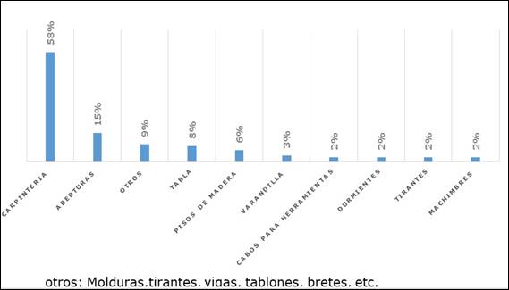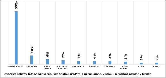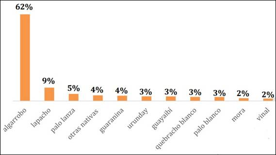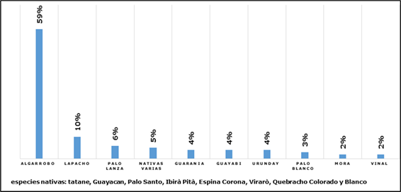 La materia prima, en su mayor proporción, es de origen nativa y es oriunda de la misma provincia. De acuerdo con la Figura 6, podemos observar que más del 60% de la producción se realiza a partir del algarrobo que es la especie de mayor utilización en la producción de muebles.